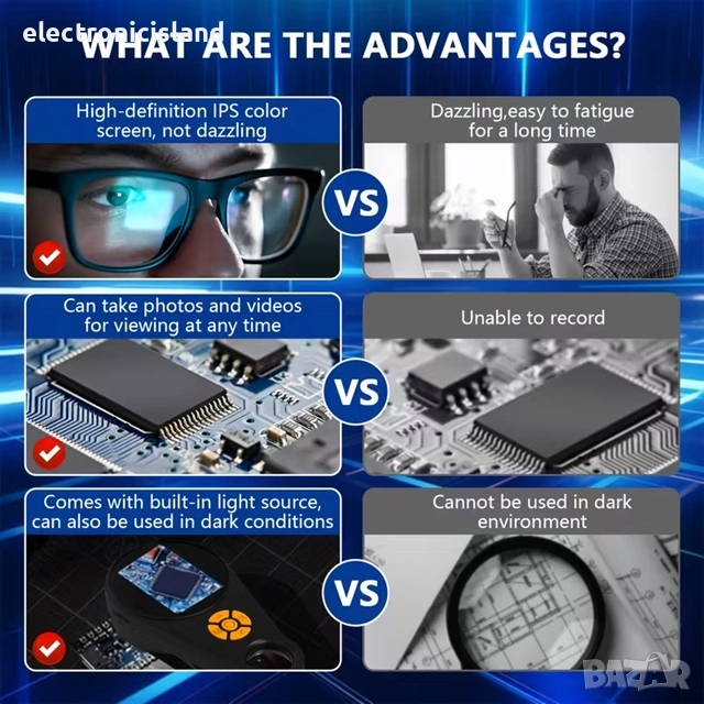 1. 10-500X непрекъснато оптично увеличение: Постигнете безпроблемно увеличение от 10X до 500X без смяна на обектива. Наблюдавайте цели печатни платки при 10-кратно увеличение или инспектирайте детайли на микронно ниво, като SMD спойки при 500-кратно увеличение.