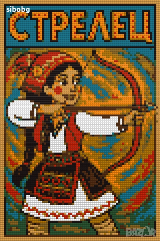 Съзвездие Стрелец, но в наш стил — игриви герои в народни носии, ярки цветове и пикселна магия!