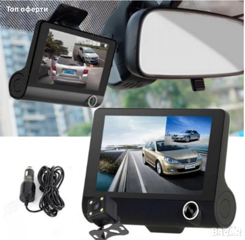 Видеорегистратор с 3 камери – Full HD 1080P, 4" дисплей, нощно виждане и G-сензор. Пълен обзор – предна, задна и вътрешна камера. Запис, паркинг мониторинг и автоматичен старт.