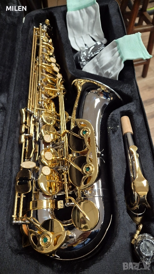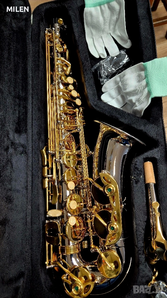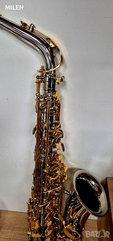 Алт Саксофон Ново. Основа сребрист, клапите златисти. Ново пълен комплект.
