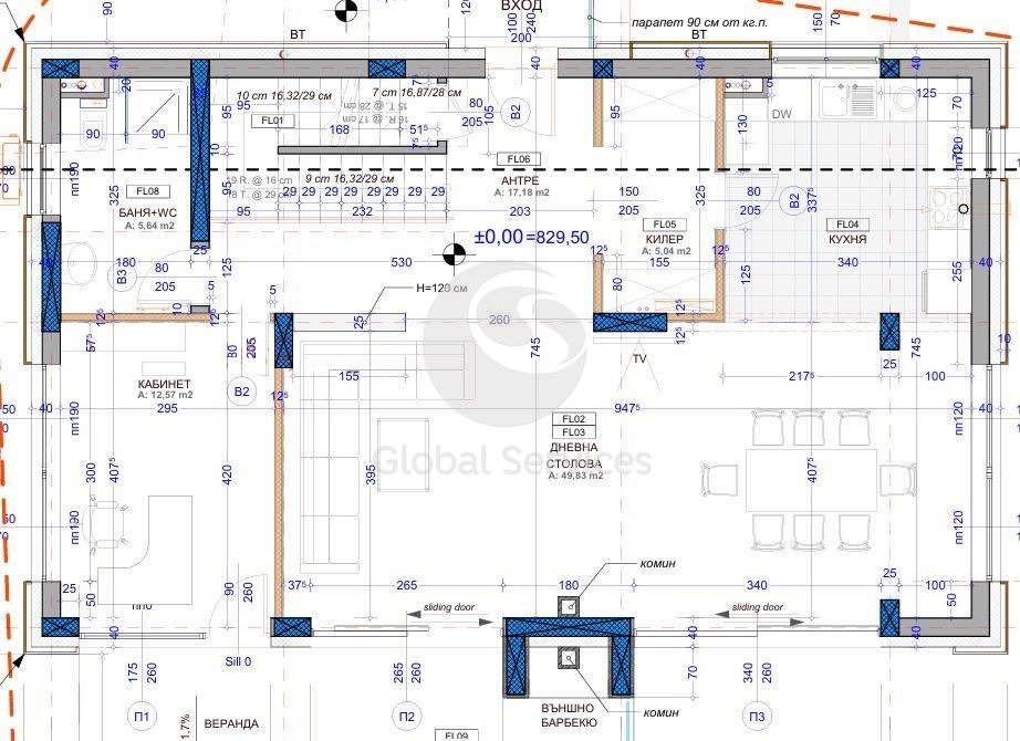 Партер фоайе, склад, кухня, дневна с тераса, кабинет, тоалетна и баня за гости.
