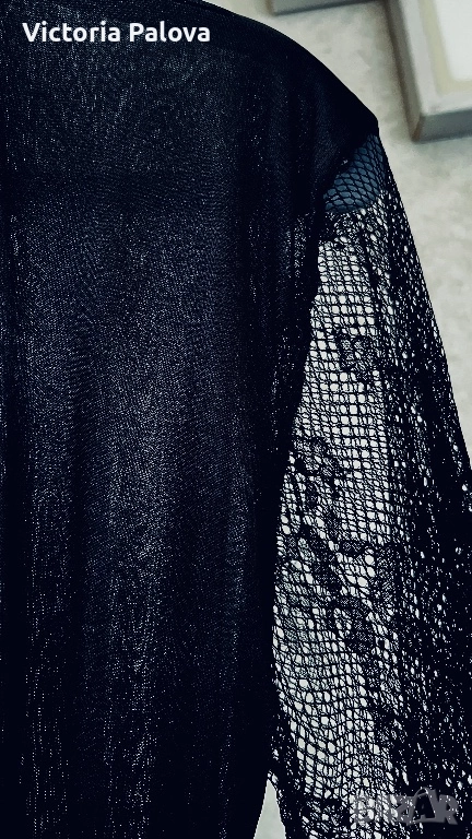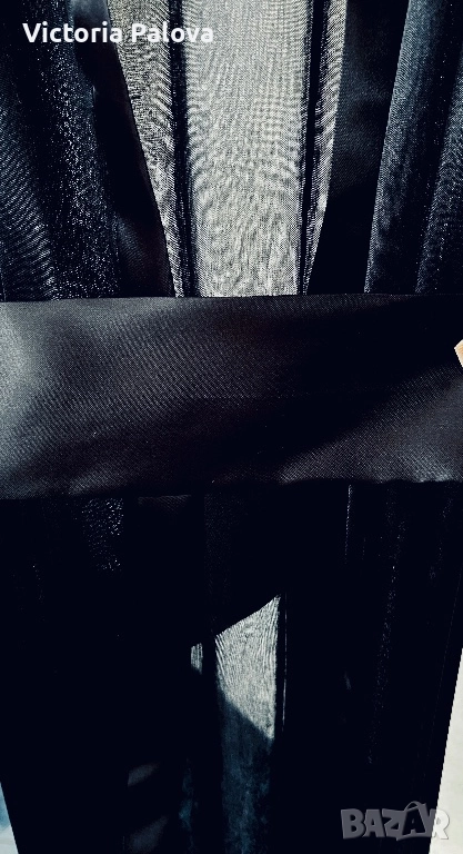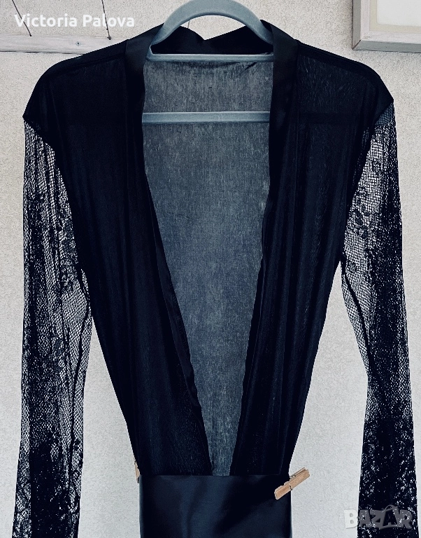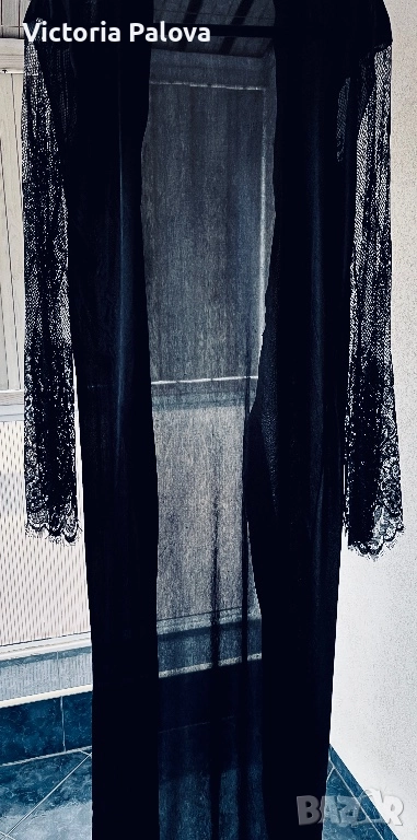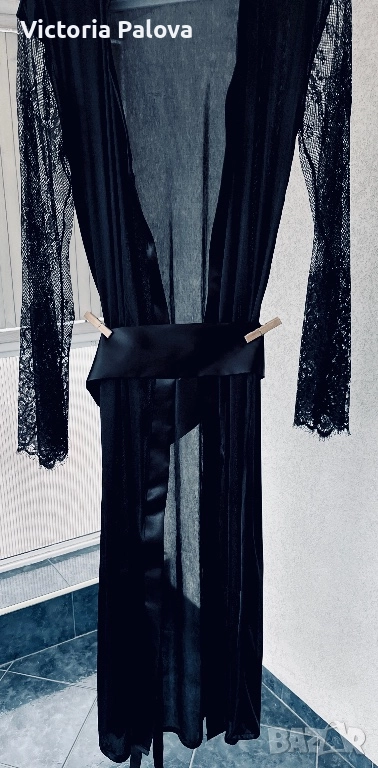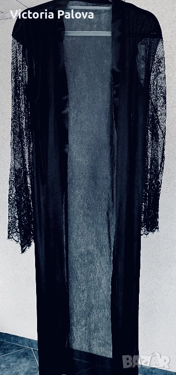 пеньоар - класически, много женствен и леко будоарен модел, основната материя е фин полупрозрачен шифон ( полиестер с лека еластичност),който пада меко и ефирно по тялото. Ръкавите са изцяло от еластична дантела с нежен флорален десен. Отпред е напълно отворен, без копчета, и се затваря само с широк колан. Кройката е свободна и удобна, дължината е 135см. Целият силует е лек, въздушен и изключително елегантен, идеален е за сутришно кафе в красива обстановка, за релакс у дома, за снимки или просто да се чувстваш специално в собственото си пространство. Истински малък лукс в черно, който никога не излиза от мода. Рамо - 54см, ГО - 54см.