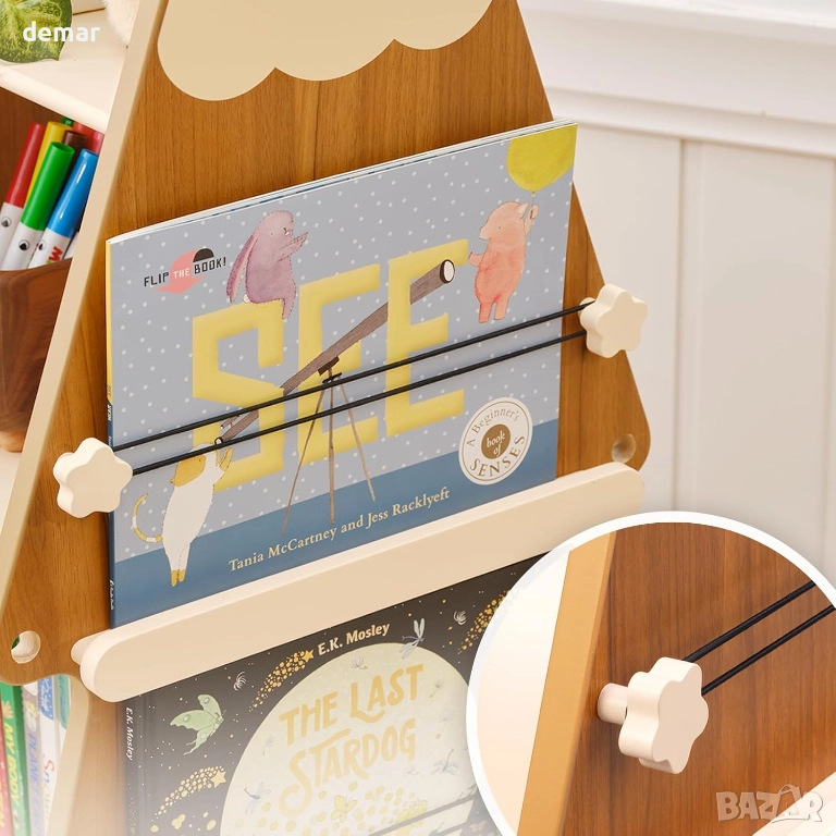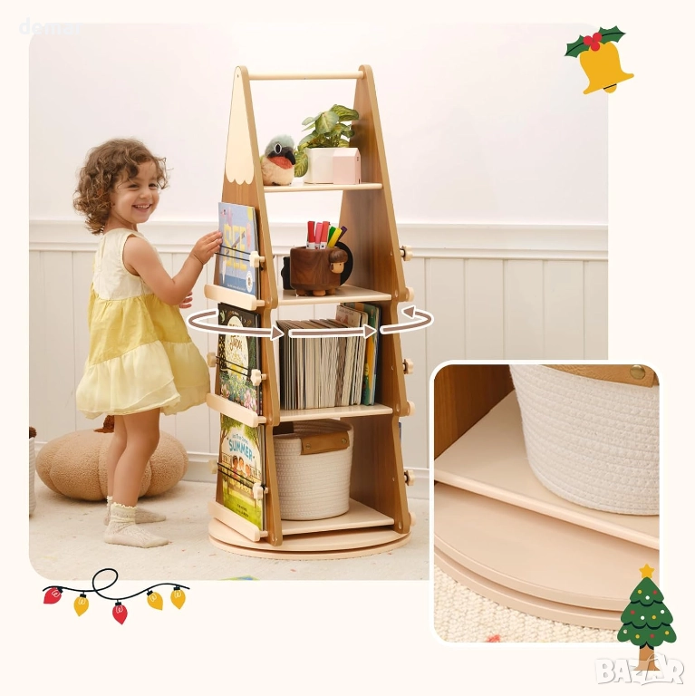 Тази въртяща се библиотека съчетава уникален дизайн на коледна елха с ежедневна практичност, изработена от издръжлива масивна борова дървесина с плавно въртене на 360° и стабилна кръгла основа. Нейният компактен размер се вписва идеално в ъглите, като същевременно предлага лесен достъп до книги, което я прави идеална за малки апартаменти, детски стаи или домашни офиси. Естественото дървено покритие ѝ позволява да служи като празнична декорация по време на празниците или като атрактивен декор през цялата година. Сглобява се лесно с включени инструкции, а гладката повърхност се избърсва с влажна кърпа.