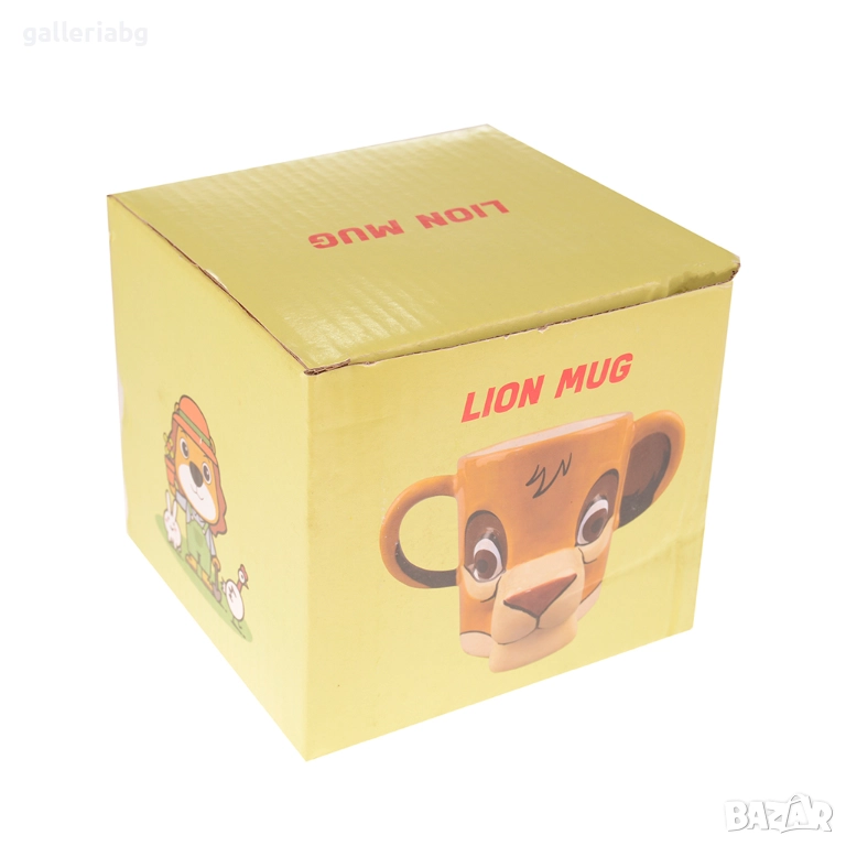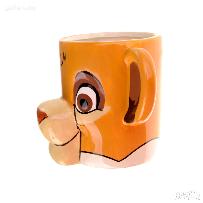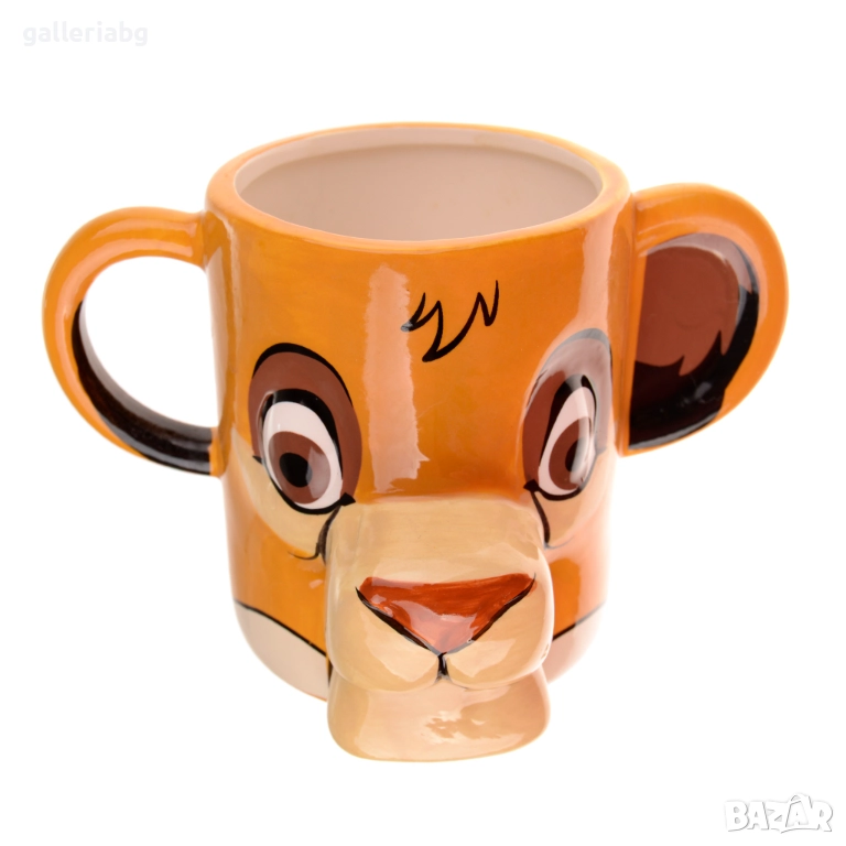Керамична чаша с 3D релеф във формата на лъвче, вдъхновено от „Цар Лъв“. Ушичките служат за две удобни дръжки, а формата на главата прави всяко кафе, чай или топъл шоколад много по-забавни.