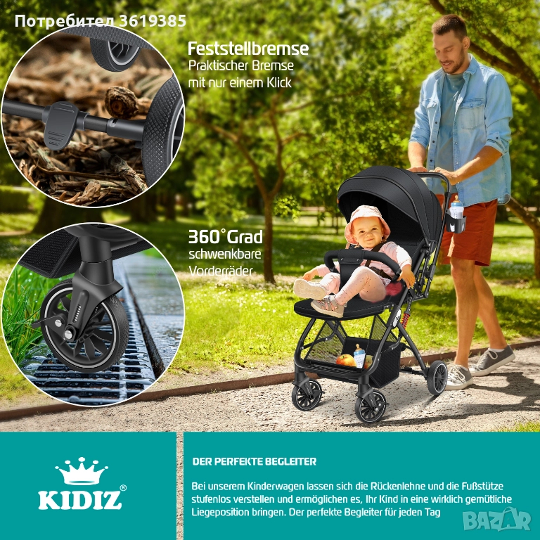 Перфектният спътник за всяко време – 360° въртящи се предни колела, регулируема облегалка и поставка за крачета, включва покривало против атмосферни влияния, мрежа против комари и калъф за крачета.