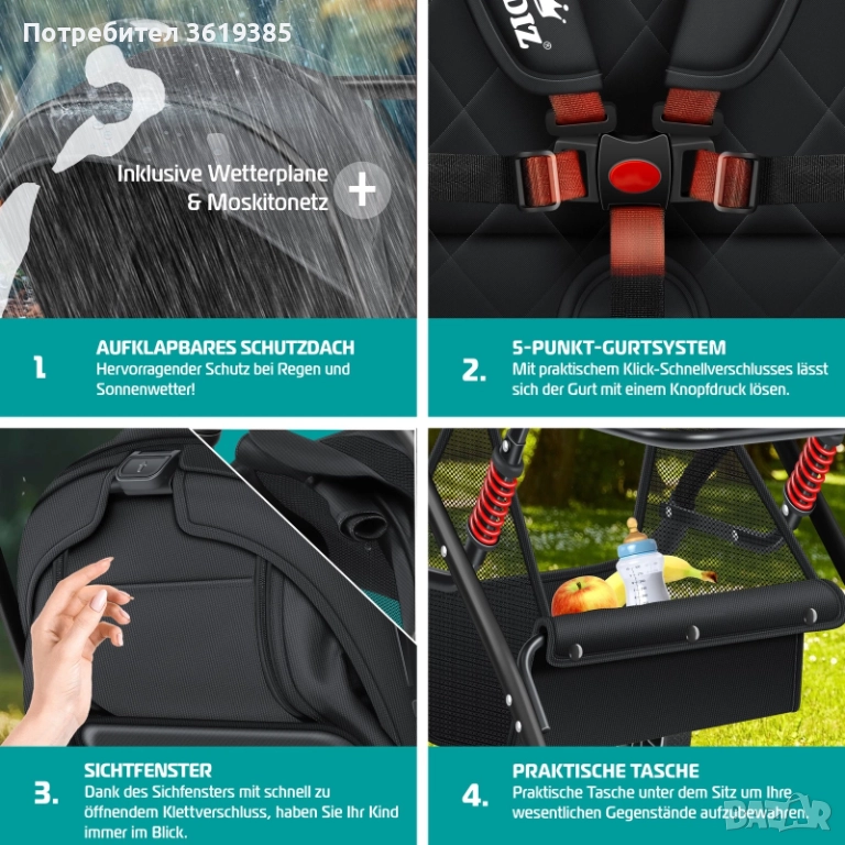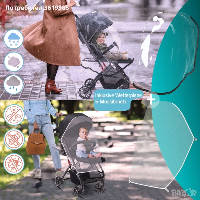 • Включени са покривало против атмосферни влияния, мрежа против комари и калъф за крачета