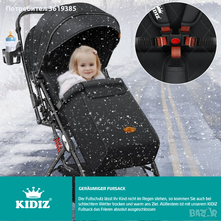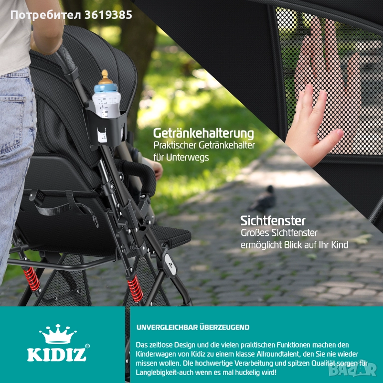 Количката KIDIZ е оборудвана с множество функции гарантиратиращи комфорта и безопасността на вашето дете. Сгъваемият сенник с прозорец предпазва детето ви от вредните UV лъчи, докато прозорецът за наблюдение с бързо закопчаване с велкро ви позволява да наблюдавате детето си през цялото време. Сваляемият покрив осигурява допълнителен комфорт и улеснява влизането и излизането.