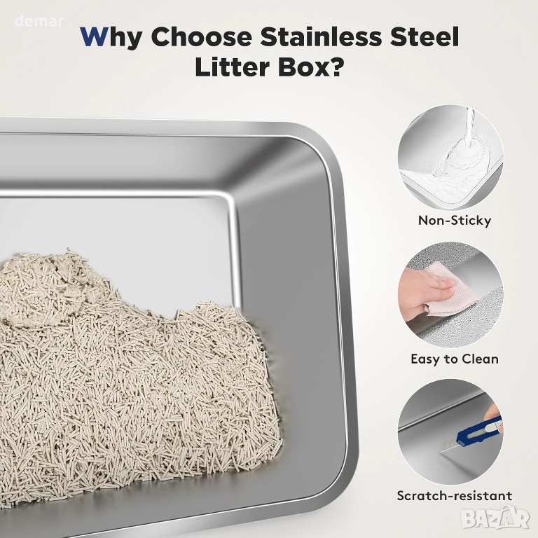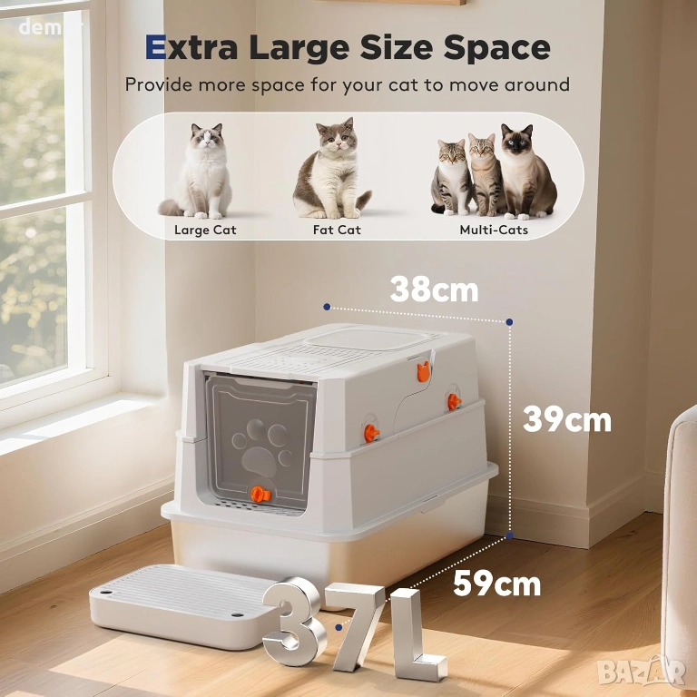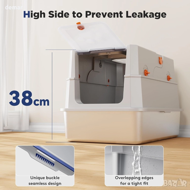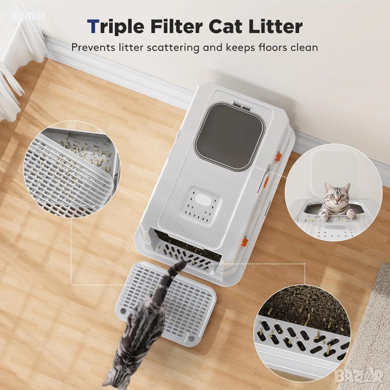 Тази котешка тоалетна от неръждаема стомана разполага с удобен капак с отварящ се горен слой и подвижна трислойна структура за лесно почистване и херметичност. Предлага както преден, така и горен вход, за да отговаря на различните предпочитания на котките, с филтърен педал, който намалява следите от отпадъци и осигурява по-лесен достъп за по-възрастни или по-ниски котки. Гладката, незалепваща вътрешност от неръждаема стомана, затвореният дизайн и вграденото дезодориращо отделение помагат за контролиране на миризмите, докато просторният XXL размер (59 x 38 x 39 см) осигурява на котките достатъчно място и побира достатъчно тоалетна за продължителни периоди.
