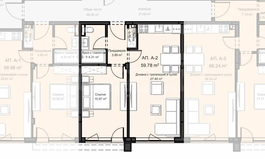 Апартаментите се предават в степен на завършеност по БДС, на шпакловка и замазка: