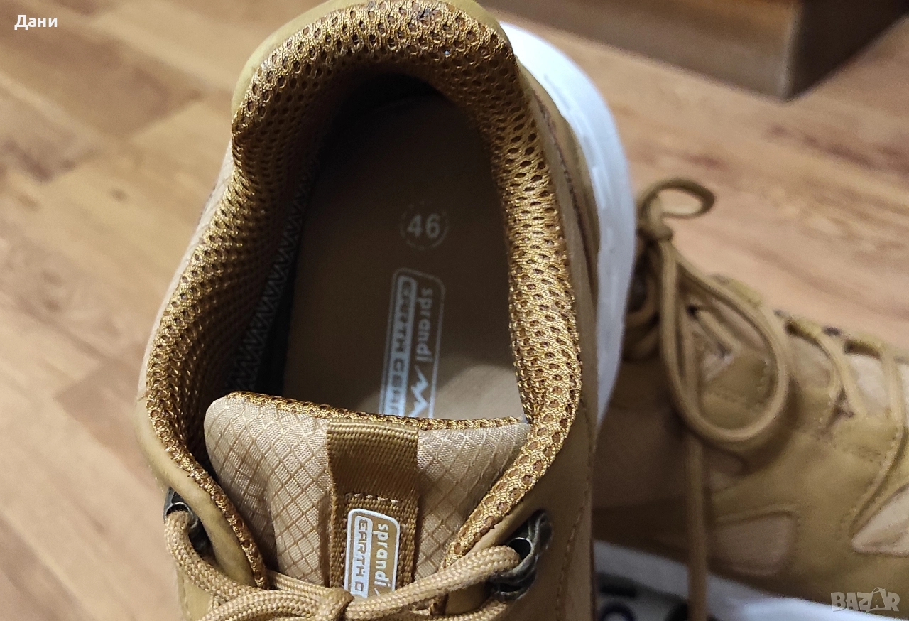 Нови маратонки Sprandi No 46.Цвят камел. Лека подметка. Дължина на стелката 30 см.Обща височина на обувката 14 см, дебелина на подметката 3.5 cm