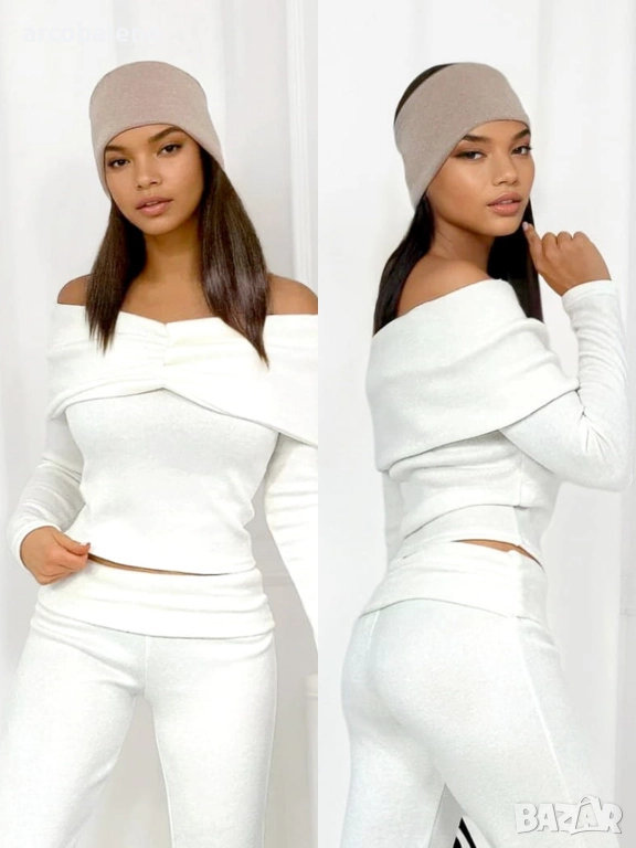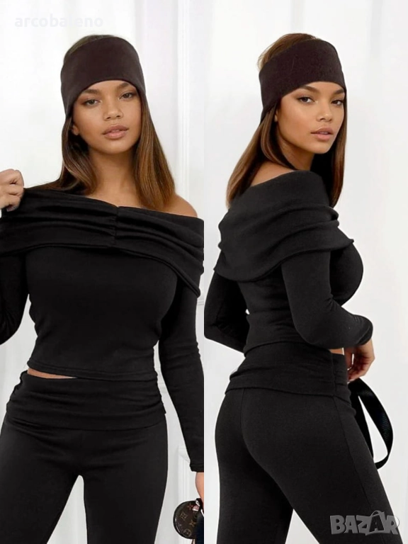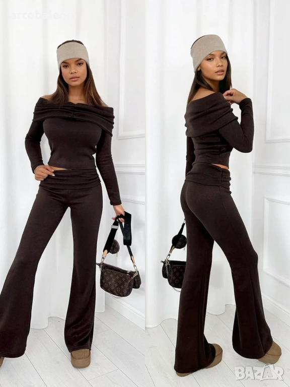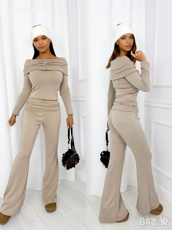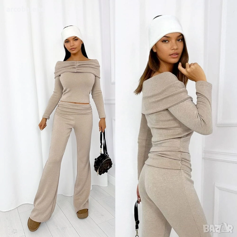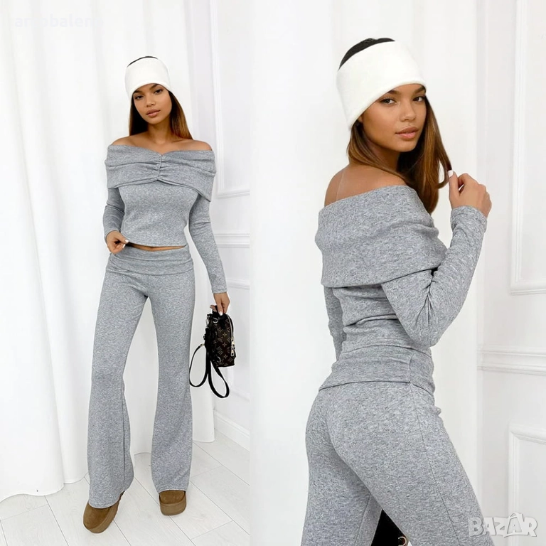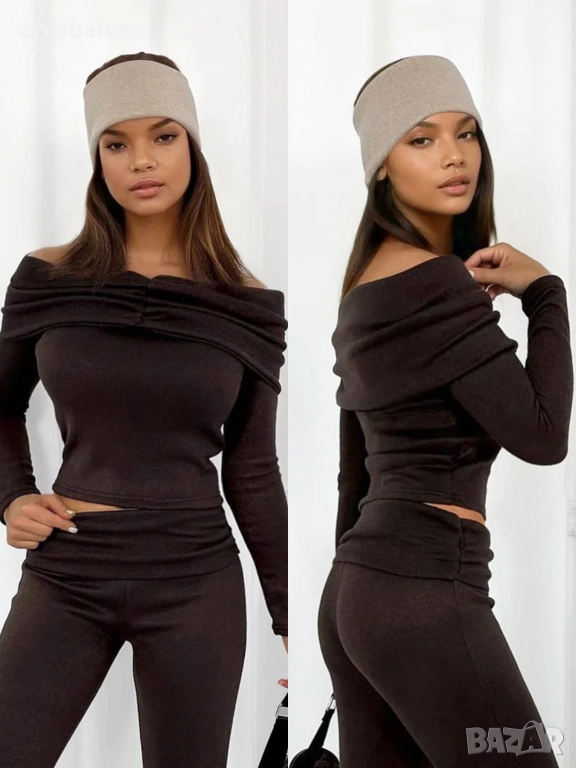 Стилен комплект, изработен от мека, еластична плетка, състоящ се от блуза с открити рамене и разкроен панталон . Комплектът перфектно ласкае фигурата, съчетавайки комфорт с елегантност. Перфектен избор за ежедневно носене, среща с приятели или небрежна вечер.