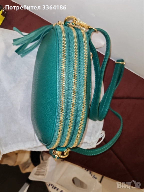 Нова, италианска чантичка от естествена кожа, синьо - зелена. Три отделения, всяко се затваря с цип. Размери - показани на снимките.