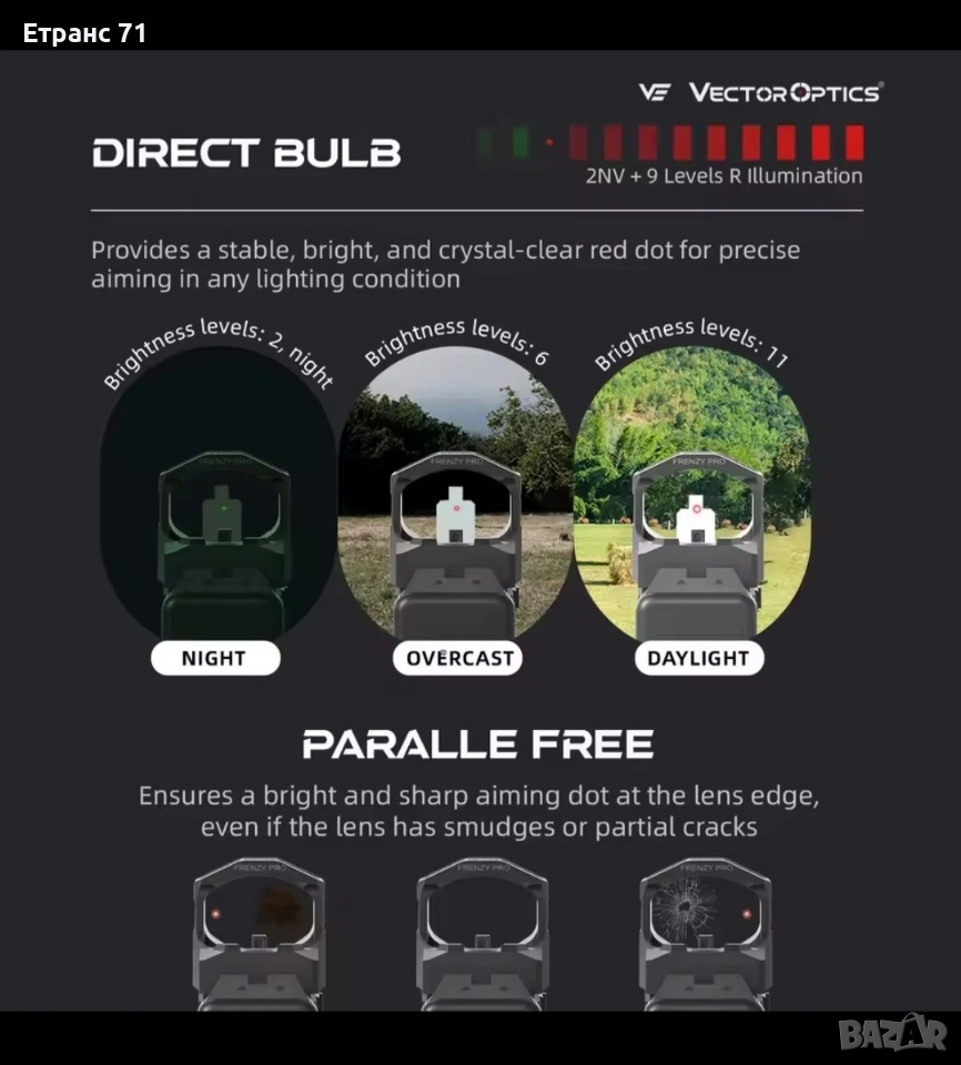 Продавам бързомер Vector Optics Frenzy-X 1x19x28 Gen II – перфектен за лов и спортна стрелба! Този ултракомпактен червен точков мерник предлага 3 MOA точка, 19x28 мм прозорец, 9 дневни и 2 нощни нива на осветление, с motion сензор за автоматично включване/изключване и батерия CR2032 с живот до 50 000 часа. Изработен от 7075-T6 алуминиева сплав, е водоустойчив (IPX7), издържа на удари до 1000G, тестван на 12GA, 300win mag и 338 lapua и има >45 MOA корекции по височина и вятър, с MOJ footprint и Weaver монтаж в комплекта. Включва гумени капачки за леща, хекс ключ и ръководство – в отлично състояние, използван минимално. Идеален за пистолети, пушки или ловни оръжия – прецизен, лек (само 39.5 г без монтаж) и надежден. Доживотна гаранция!