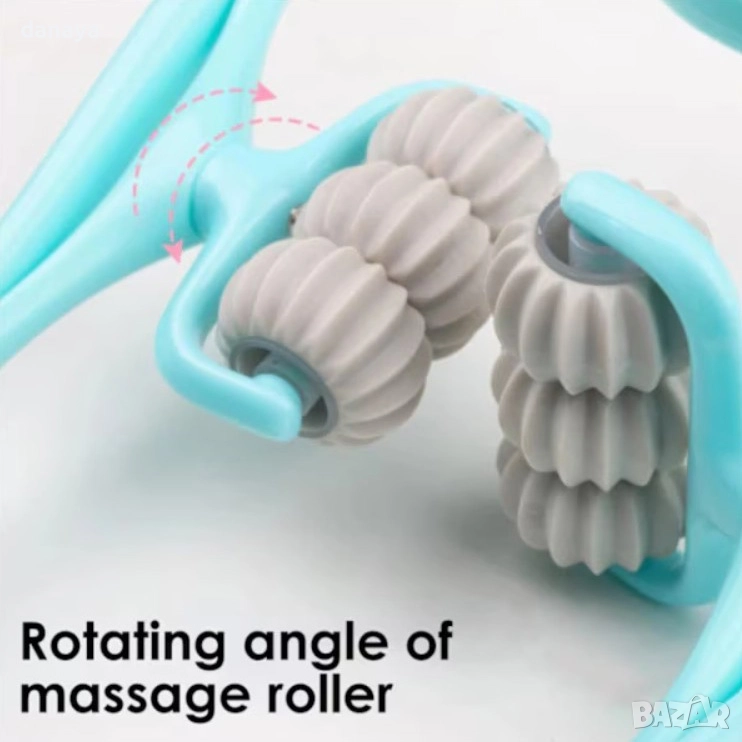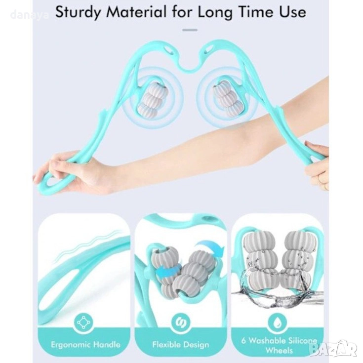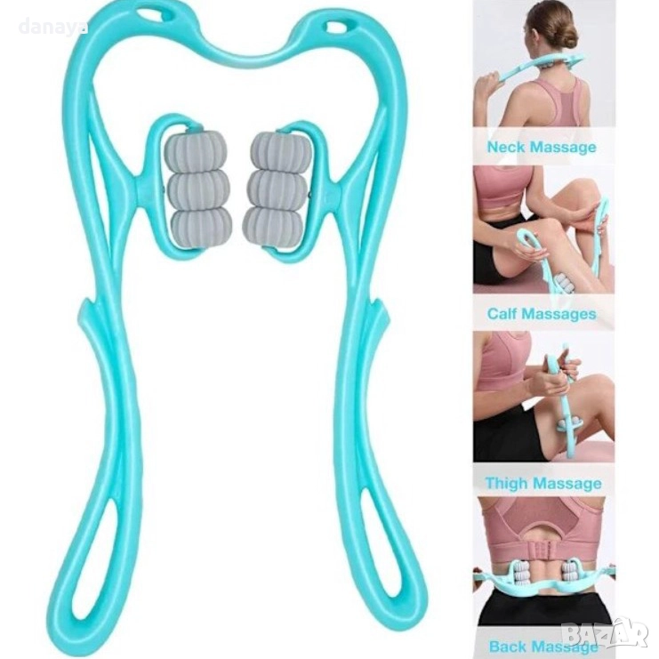 Този масажор с двойни въртящи се ролки е създаден да облекчава напрежението във врата, раменете, гърба, прасците и бедрата. Ергономичната форма позволява да регулирате натиска според нуждите си, а меките силиконови ролки осигуряват дълбок и отпускащ масаж.