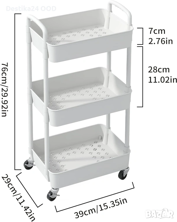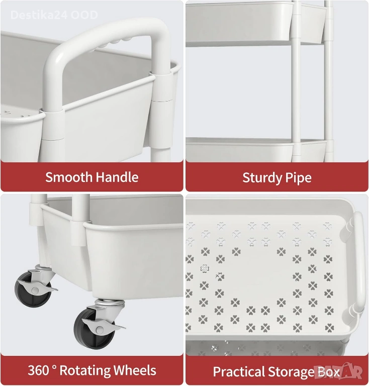 Практично и стилно решение за съхранение в кухнята, банята, хола, офиса или спалнята. Количката е лека, стабилна и се мести лесно благодарение на 4 въртящи се колела на 360° и удобна дръжка.