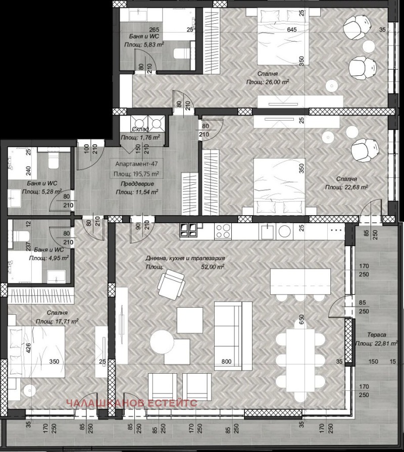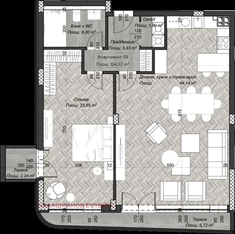 Апартаментите се характеризират с простор и светлина обширна дневна, големи спални, функционални разпределения.