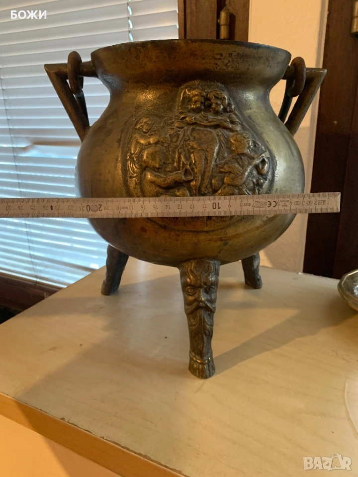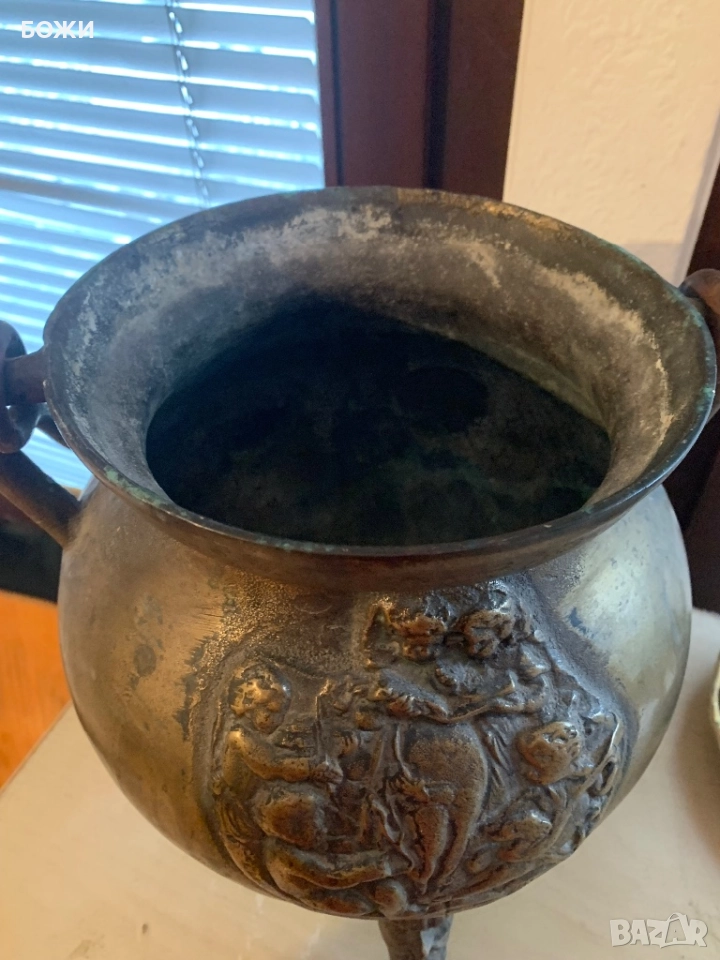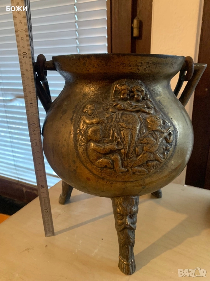 Продавам масивен стар бронзов съд / триножник, изработен в класически античен стил с богати митологични релефи. Артикулът е тежък 10 кг и висок 30 см – напълно автентична отливка, не е кухо или тънко копие.