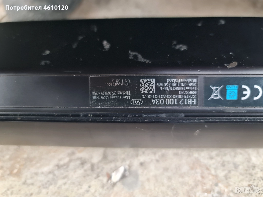 2. Батерия Bosch PowerTube 750 Smart system - батерията се зареди биз проблем. Малка забележка - четвъртото светодиодче е обелено отгоре, както се вижда от снимката. Цена 310 евро