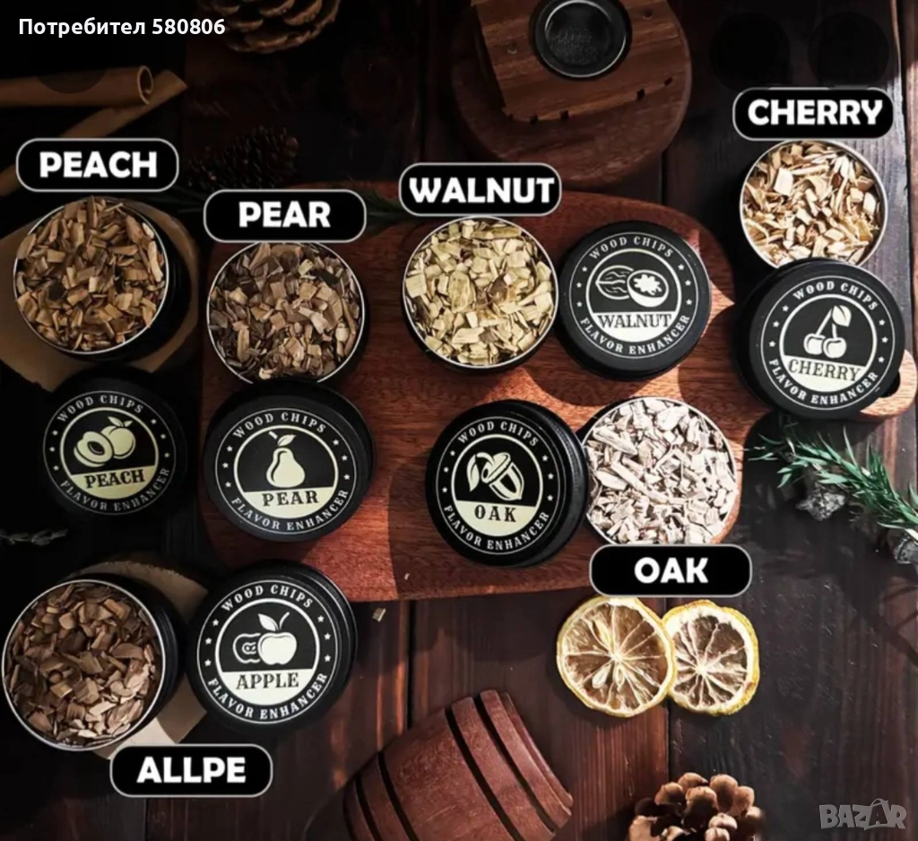 Сета включва опушвател и 6 различни аромата - ябълка, череша, праскова, дъб, орех, круша, лъжичка и четка за почистване.