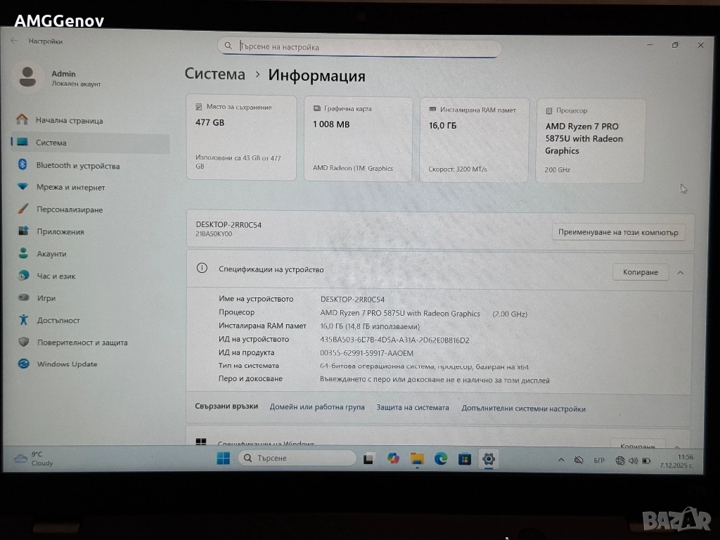 - AMD Ryzen 7 Pro 5875u 8-ядрен/16-нишки 16MB Cache до 4.5Ghz