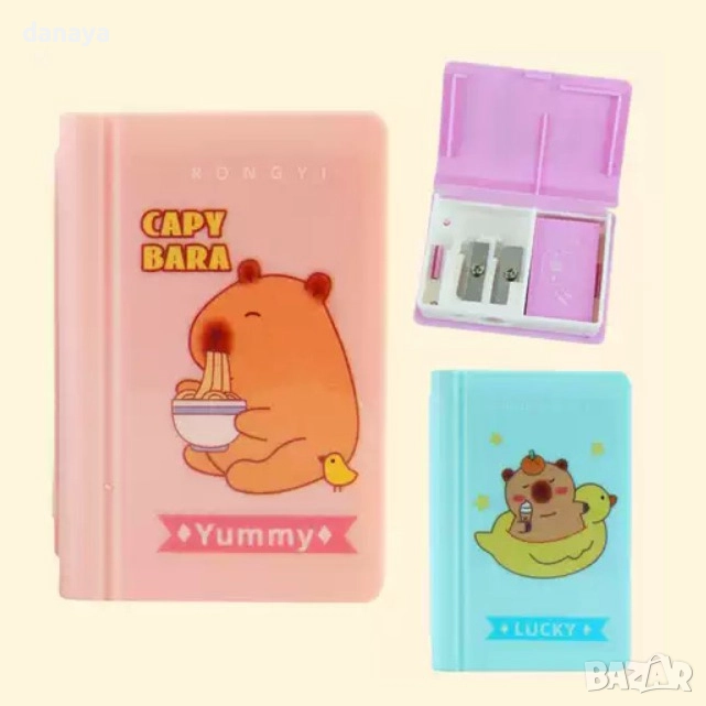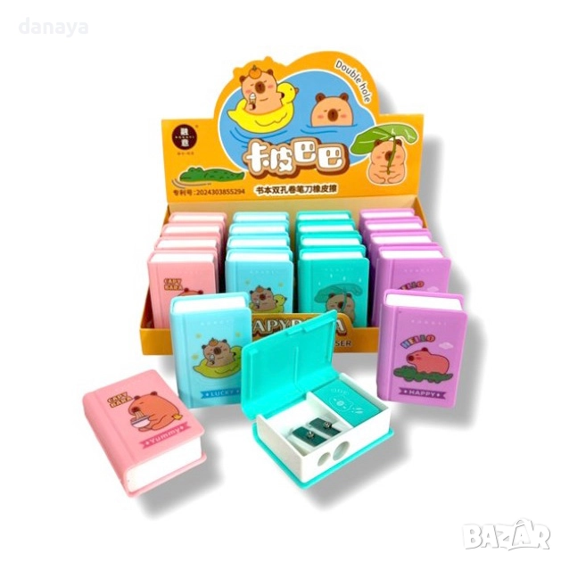 Двойна острилка с гумичка във форма на книга – с картинки на капибара.