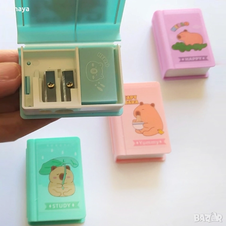 Тази компактна острилка с форма на малка книга е едновременно практична и очарователна. На корицата са изобразени забавни и сладки картинки на капибара, които веднага привличат вниманието и я превръщат в любим ученически аксесоар.