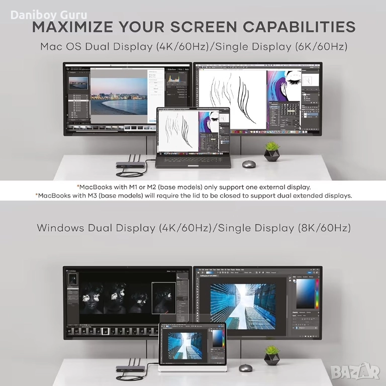 Видео изход - 4K @ 60Hz двоен екран, 8K @ 30Hz или 6K на един екран за Mac. Насладете се на два външни дисплея с модели MacBook M5/M4. Базовите модели MacBook M3 поддържат два външни дисплея в режим „clamshell“. Базовите модели MacBook M2/M1 поддържат само един външен дисплей. НЕ работи със софтуера DisplayLink.
