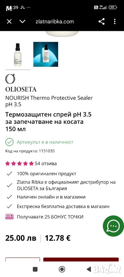 НОВО OLIOSETA NOURISH Термозащитен запечатващ спрей за мигновен блясък pH 3.5, 150 мл → Обява 52679697
