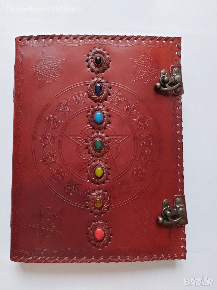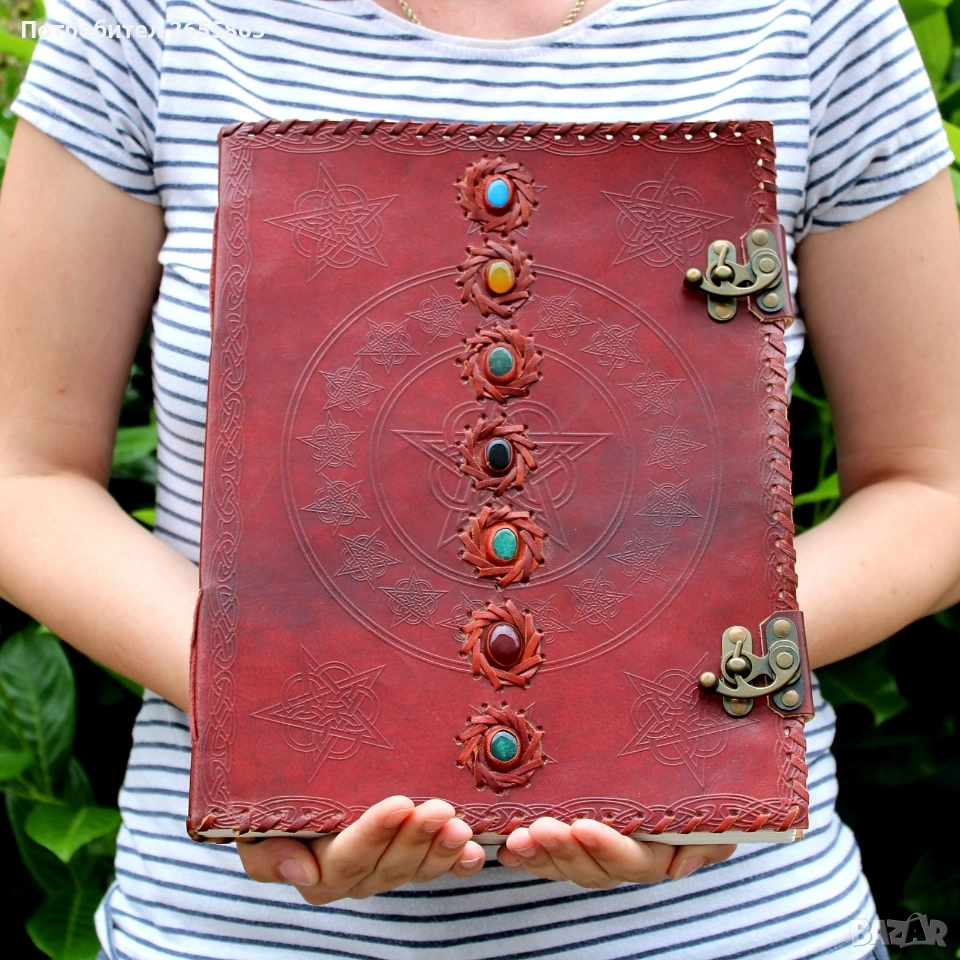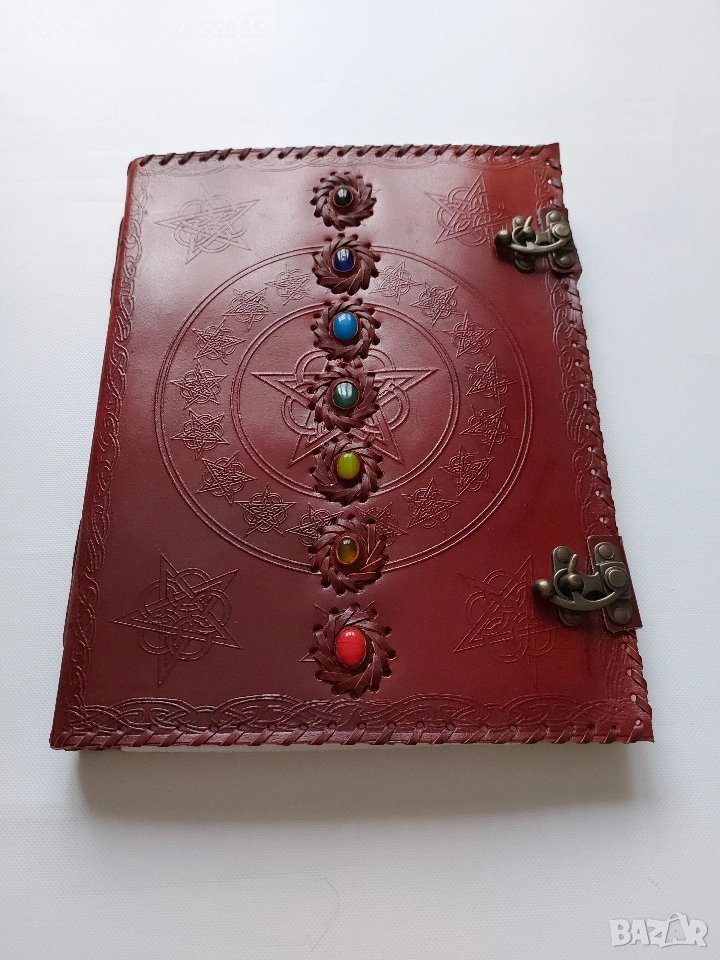 Ръчно изработен кожен бележник/ дневник, инкрустиран със седем полускъпоценни камъка, които представляват седемте чакри. Това е Дневник на ГОЛЯМАТА БЛАГОДАРНОСТ Детайли за продукта: естествена кожа и съдържа ръчно изработена крафт хартия. Дизайн: Върху корицата има релефна шарка- пентаграм Закопчава се с две изящни метални ретро закопчалки. Предназначение: Тези дневници са популярни за водене на лични записки, медитация, творческо писане, или като „Книга на сенките“ (Book of Shadows) за практикуващи езотерика и уика. Много красива на живо, има магическа притегателност. Уникален подарък за специален повод на специален човек.