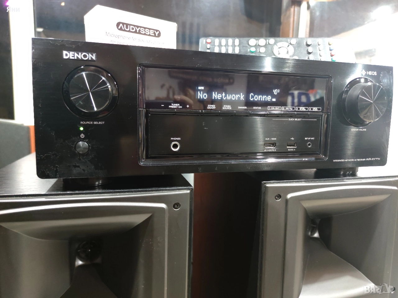 Отлично техническо състояние! Визуално няма драскотини или ужулвания но както се вижда на снимките на места има паднал лак на предния панел. Пълен комплект - оригинално дистанционно, калибриращ микрофон Audyssey MultEQ XT + оригинална стойка за него.