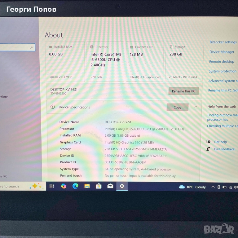 Лаптопът е в страхотно визуално състояние и технически изряден. Преинсталиран с оригинален и лицензиран Windows 10 PRO, готов за работа.