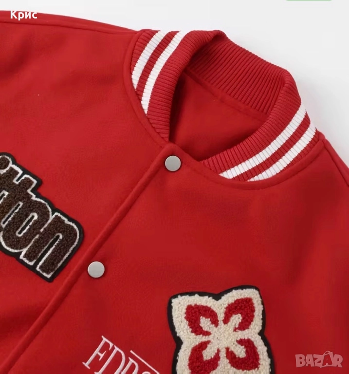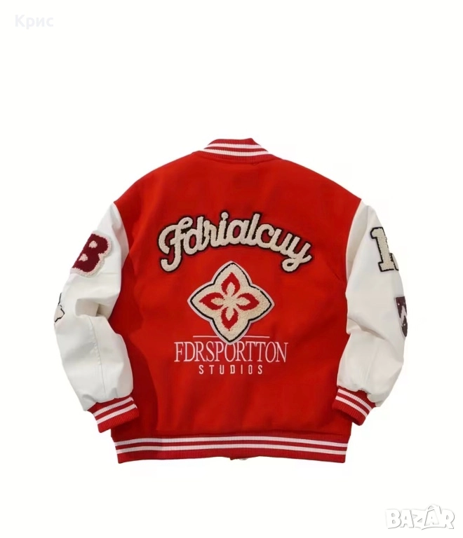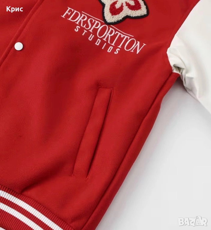 Чисто ново червено спортно бомбър яке в размер L. Стилен и удобен unisex модел с ръкави от еко кожа.