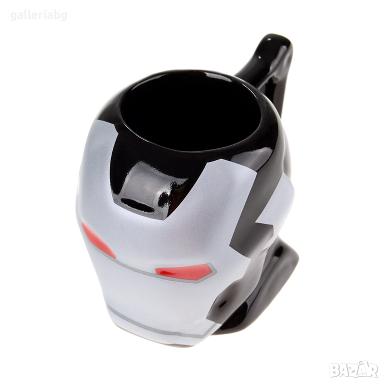 Керамична 3D чаша във формата на шлема на Iron Man в черно-сив вариант с червени очи – идеална за фенове на Marvel Avengers и по-по-тъмната визия тип War Machine. 💥