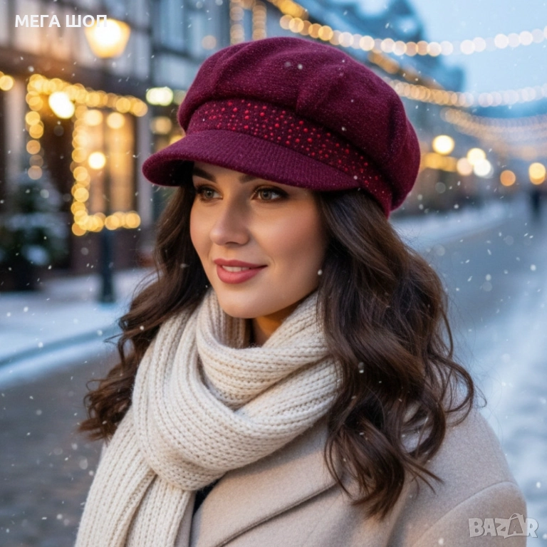 Дамска зимна плетена шапка с козирка и декоративни камъчета → Обява 52682641
