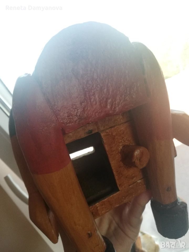 Продавам ретро дървена касичка. Запазена за времето си. Функционира. Отдолу има отвор, за да се извадят пуснатите пари. Има малко дупчици на шапката от тънко пиронче - виждат се на снимката