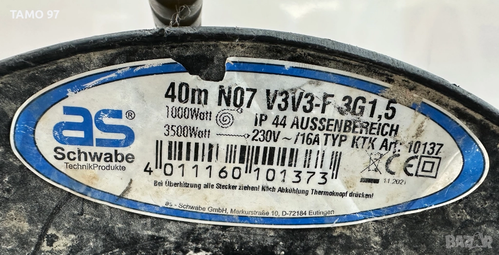 8. AS-Schwabe 10137 N07 V3V3-F 3G1.5mm² IP44 1000W-3500W / 230V с 3 гнезда 40 метра - 100лв / 51.13евро / Нова е 296лв