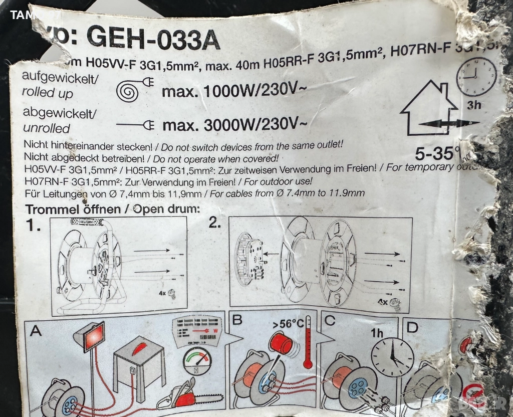 6. REV GEH-033A H05VV-F 3G1.5mm² IP44 1000W-3000W / 230V с 4 гнезда 40 метра - 110лв / 56.24евро / Нова е 223лв
