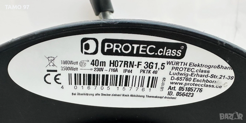 7. Protec.Class PKTK40 H07RN-F 3G1.5mm² IP44 1000W-3500W / 230V с 3 гнезда 40 метра като нова - 125лв / 63.91евро / Нова е175евро