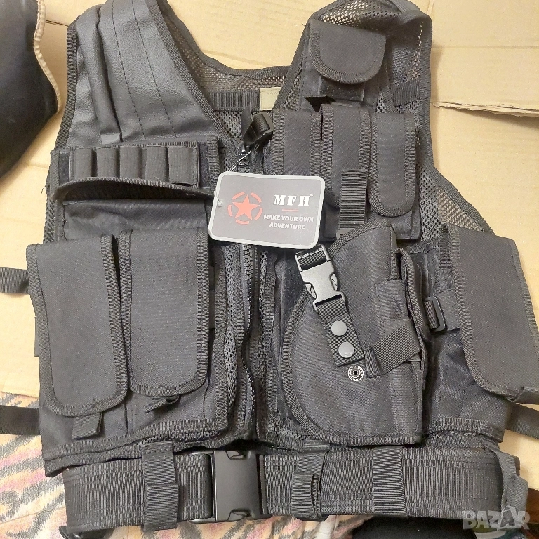 Немска тактическа жилетка MFH в универсален размер, с колан, кобур и много практични калъфи и джобове за зареждане.