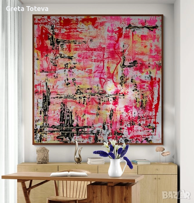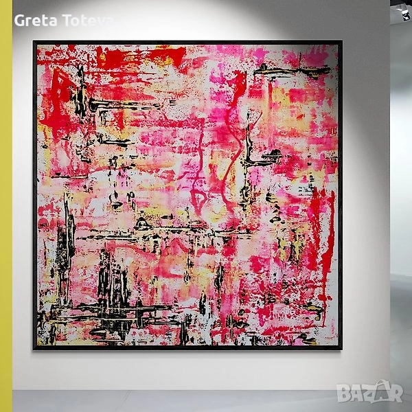 Картина с абстрактен дизайн, изпълнена в смели цветове и техники. Подходяща за декорация на дома, офиса, банка. Размер 165 cm/ 165 cm. Автор е френска художничка Bri Debernardi. Висока художествена стойност! Отлично състояние. Акрил върху платно, печат за автентичност и подпис.