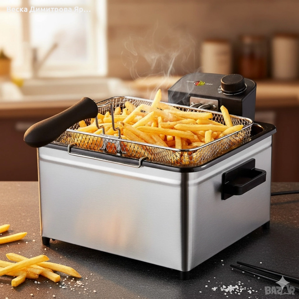 Марка/модел: Cheffinger Home CF-EDP5.0; Тип: Фритюрник (Deep Fryer); Капацитет на съда: 5 L (сваляем, незалепващо емайлиран); Материали: Неръждаема стомана – корпус и капак; Нагревател: потопяем от неръждаема стомана – бързо и равномерно загряване; Мощност: 2000 W; Захранване: 220–240 V ~ 50/60 Hz; Температурен диапазон: 150°–190°C (маркировка и във °F 302°–374°F); Индикации: Power и Heat светлинни индикатори; Капак: неръждаем, стъклен прозорец за наблюдение + вентилационни отвори; Стабилност и безопасност: неплъзгащи се крачета, VDE щепсел; Почистване: разглобяема конструкция за лесно миене; Гаранция: 12 месеца.