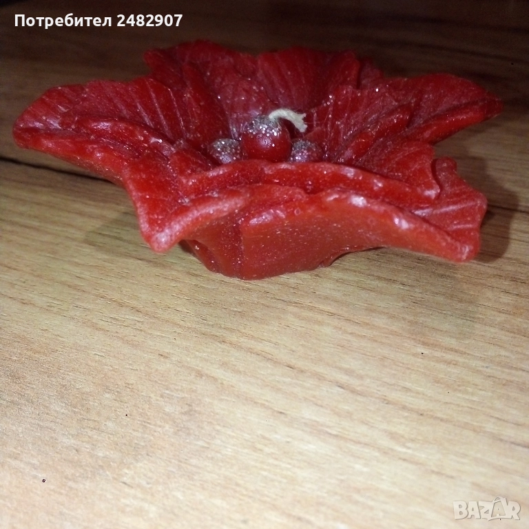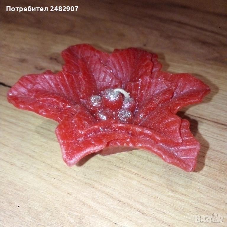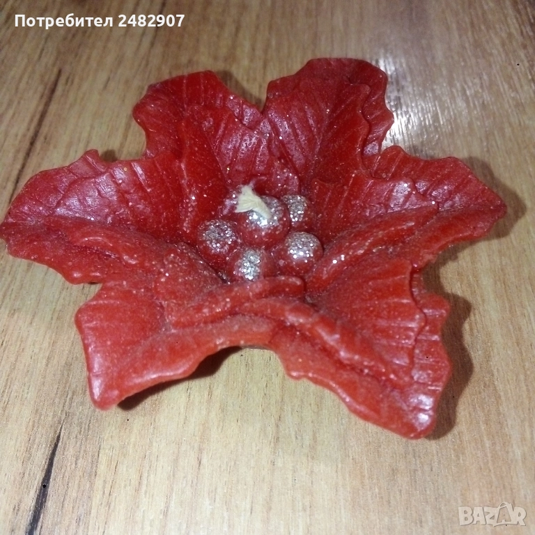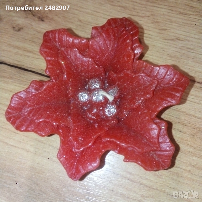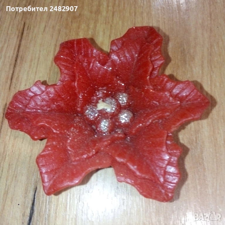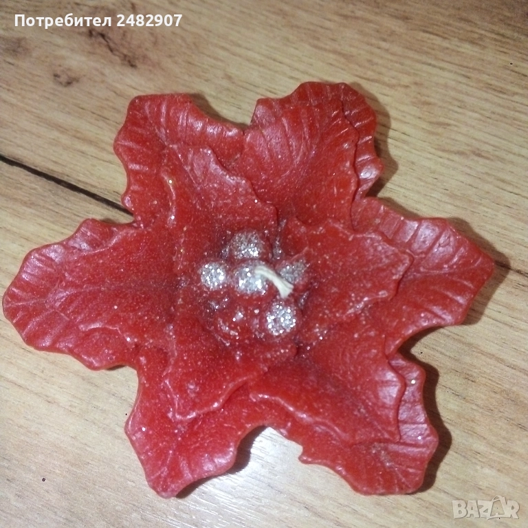 Красива, ръчно изработена плаваща червена свещ "Коледна звезда". Височина - около 3 см, диаметър - около 8 см. Много ефектна, ароматна, с блестящи частици, подходяща, както за декорация, така и за подарък. Чисто нова, не е използвана.