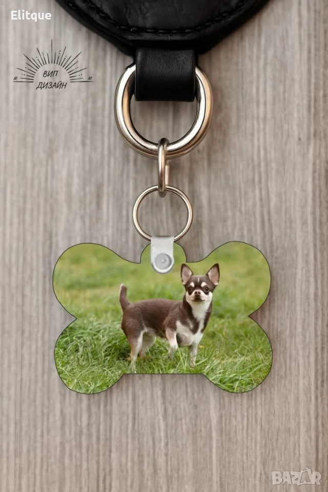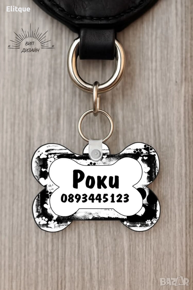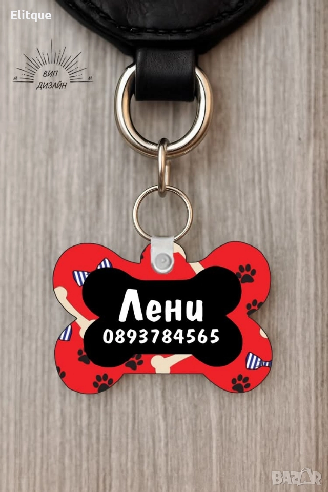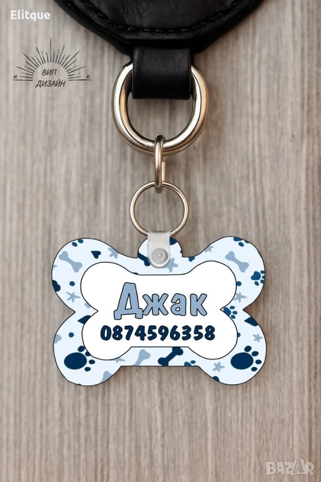Персонализиран кучешки медальон с име и телефон 🐾 Изработва се по индивидуален дизайн – цветове и надпис по ваш избор. Двустранен печат – може да е еднакъв или различен от двете страни. Възможност за добавяне на ваша снимка или изображение. Характеристики: Материал: МДФ плоскост с форма на кокал + пластмасови държачи Размер: 4 × 5 см Цена: 12 лв.