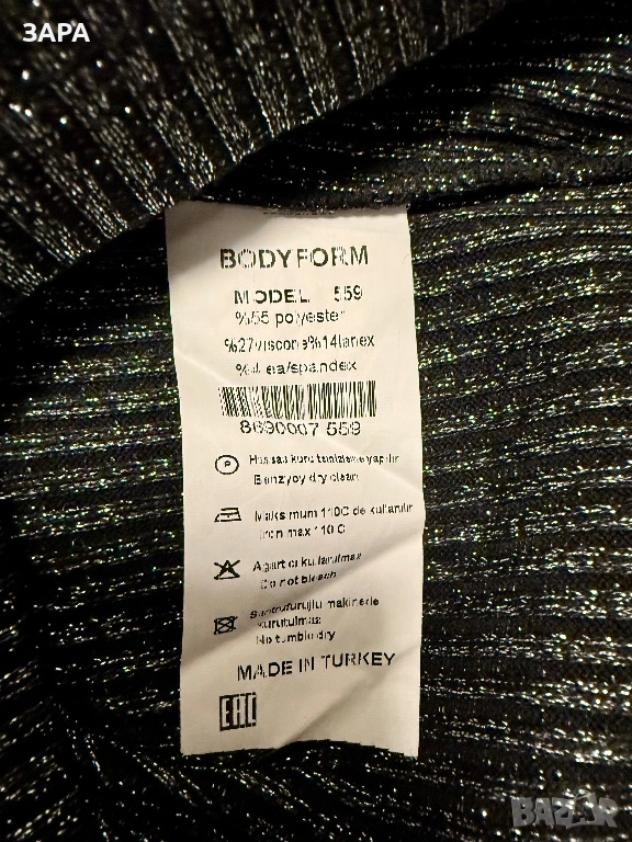 Официална сребриста рокля, силно вталена по тялото, разтеглива, нова. Размерът е 38, отговаря на S. Дължина от рамото 104 см. Стои чудесно на стройна фигура.