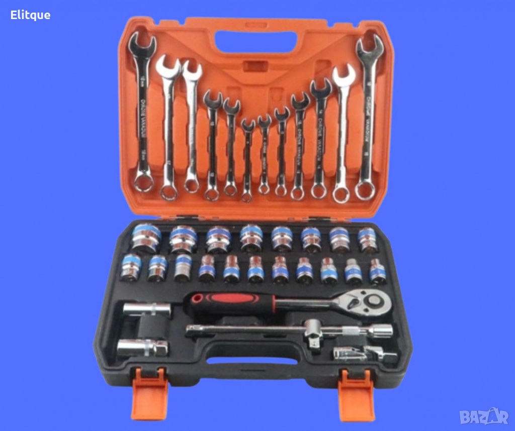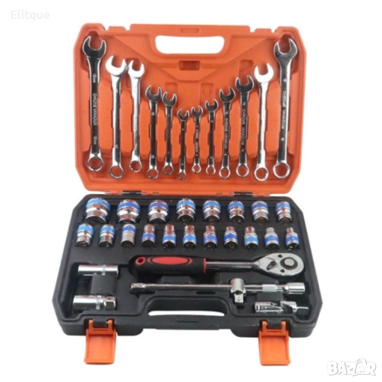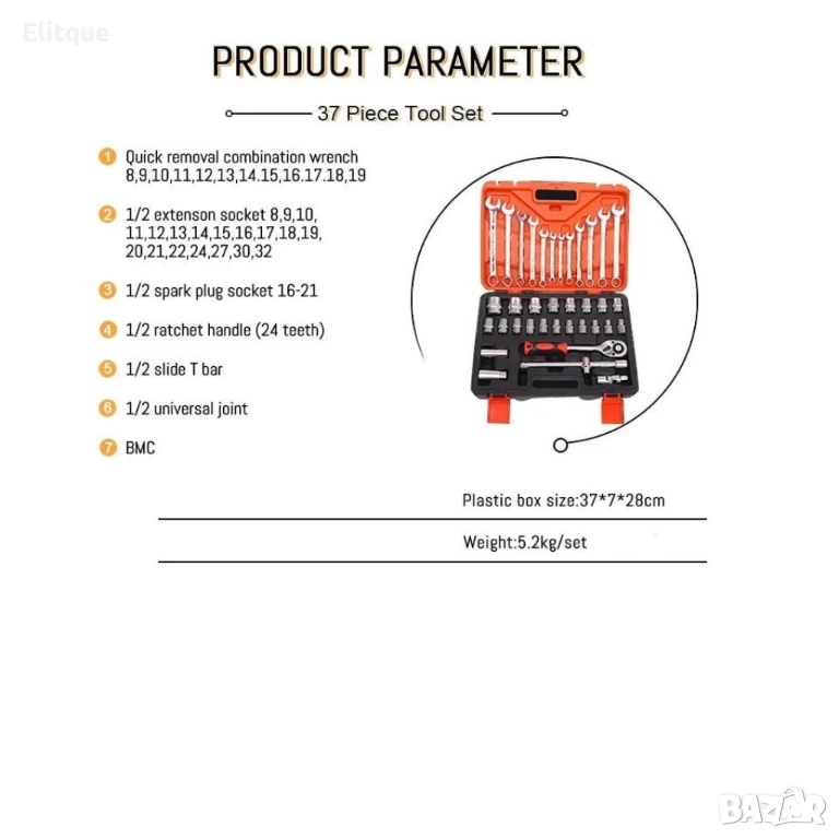 Комплектът тръбни ключове и ключове с фиксиран пръстен съдържа 37 части, изработени от хром-ванадиева стомана, което гарантира издръжливост и дълготрайност. Включва 19 глави, като осигурява разнообразие от размери, подходящи за различни приложения. Сред характеристиките са: