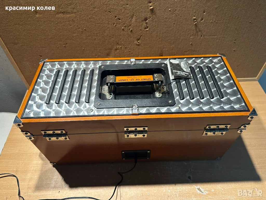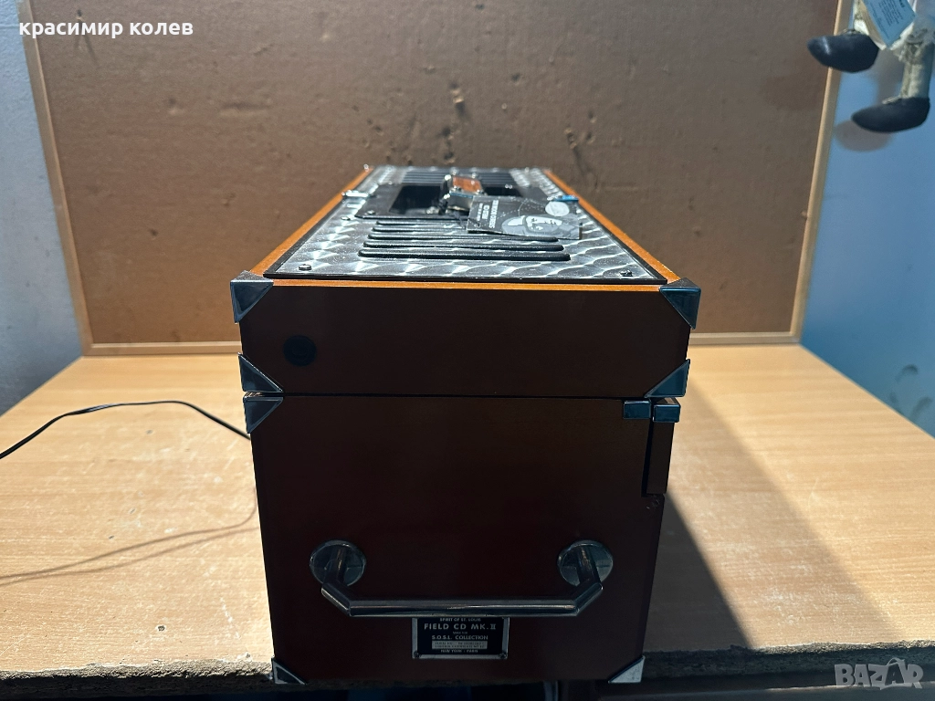 - Изглежда като куфарче от дърво и метал с два вградени високоговорителя.
