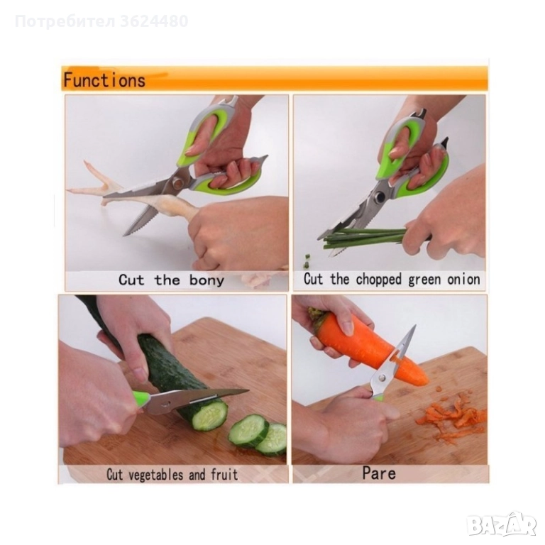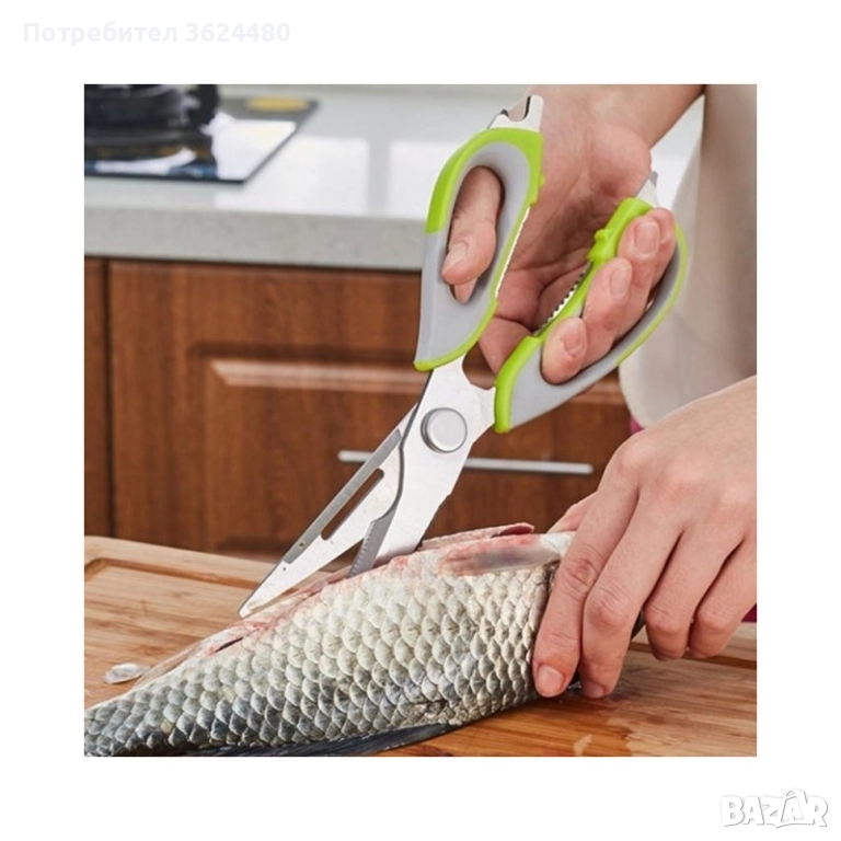Тя ще се превърне във Вашият верен помощник в кухнята! С ножицата може лесно да режете пиле и кости, почиствате риба, отваряте бутилки, белите зеленчуци, трошите ядки и отстранявате черупки! Дръжките са и гумирани за по-удобно използване. В комплекта има удобен за съхранение пластмасов калъф. Ножицата може да се разглоби само с 1 движение, много лесна за почистване.