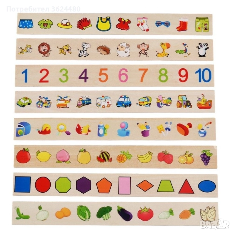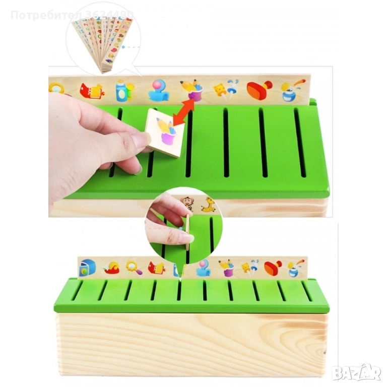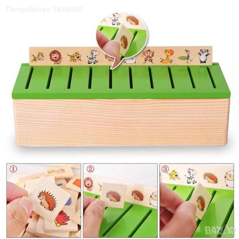 След като детето овладее тази игра, дайте му още чипове, общо са 80, така че детето само да търси необходимите чипове на дадена тема. Играта е страхотна и вие определяте нивото на сложност. Кутията за сортиране разширява речника и хоризонтите, развива фините двигателни умения, учи детето да класифицира изображения в групи, учи го да прави разлика между животни, плодове, зеленчуци, числа, геометрични фигури, да познава числата и да брои.