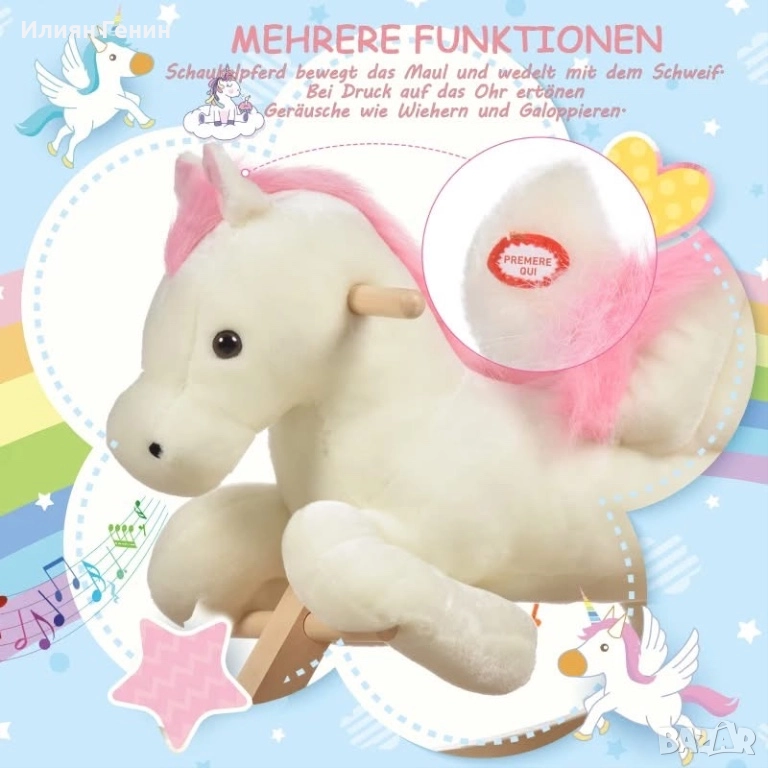 Класическа играчка с автентични звуци: Съчетава традиционен дизайн на кон с актуализирани функции, като електронно цвилене и галопиращи звуци при натискане на ушите.