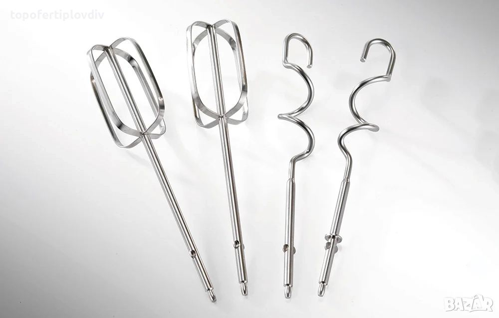 Миксерът се предлага с два вида аксесоари: бъркалки за разбиване и куки за тесто. С тях можете лесно да приготвяте както леки смеси, така и по-тежки теста с мая. Аксесоарите са лесни за инсталиране и могат бързо да се сменят с натискане на бутон за освобождаване за допълнително удобство.